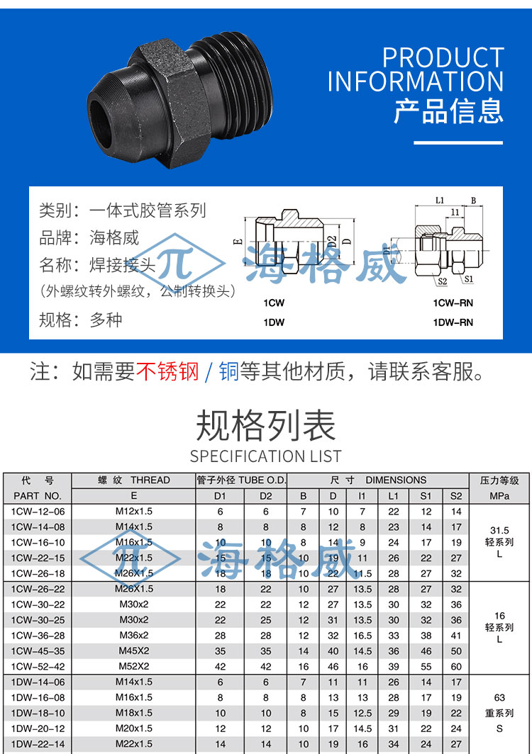 » 焊接接头外螺纹转外露纹(公制转换头)-1CW